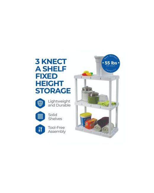 Declutter your home, office, or garage with the 2-pack of Knect-a-Shelf Light Duty 3-Shelf Interlocking Storage Shelves by Gracious Living. These durable yet lightweight shelving units are perfect for organizing tools in the garage, files in your office, or anything else that needs storage.Made of sturdy plastic, each 3-shelf unit holds up to 55 pounds per shelf, supporting a total of 165 pounds per unit without bending or wearing down. Thanks to its innovative interlocking system, you can connect multiple shelves together to create a custom storage solution.With a clean white finish, these shelves blend seamlessly into any room. They are easy to assemble without tools, offering a hassle-free setup.Standing nearly 3 feet tall and 2 feet wide, these units are ideal for organizing spaces like garages, basements, laundry rooms, or utility areas. Get organized today with the 2-pack of Gracious Living Knect-a-Shelf Light Duty 3-Shelf Interlocking Storage Units.