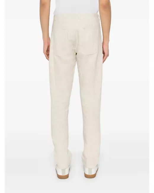 light beige front button fastening two side slit pockets two rear patch pockets tapered leg
