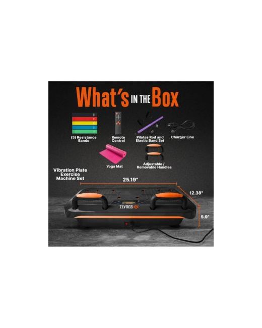 The Squatz Vibration Plate Exercise Machine Set is a versatile fitness tool designed to help you improve muscle tone, flexibility, and overall fitness. Featuring 5 unique vibration settings, this machine enhances regular exercise movements, promoting better circulation, stress relief, and muscle relaxation. The set includes Pilates rods, resistance bands, and an anti-slip fitness mat, making it ideal for physical therapy, strength exercises, and at-home rehabilitation. Its lightweight, portable design and durable construction ensure that it fits seamlessly into any home workout routine.