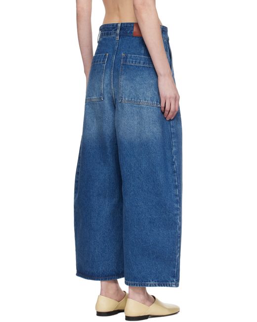 Wide-leg 14 oz non-stretch regenerative cotton-blend denim jeans. Fading and whiskering throughout. · Loose-fit · Belt loops · Four-pocket styling · Zip-fly · Curved outseams · Dropped inseam · Leather logo patch at back waistband · Contrast stitching in tan Supplier color: Worn wash indigo