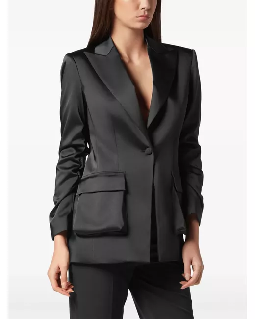 black front button fastening two side cargo pockets peak lapels draped detailing