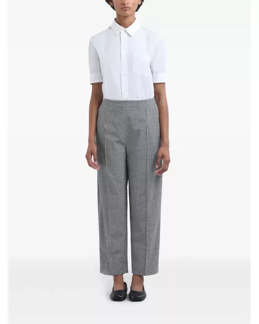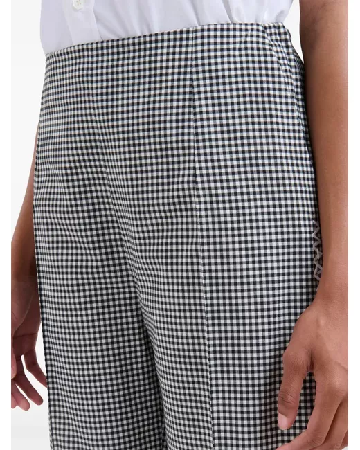 white/black textured finish gingham check pattern vertical seamed two side slash pockets two rear welt pockets straight leg