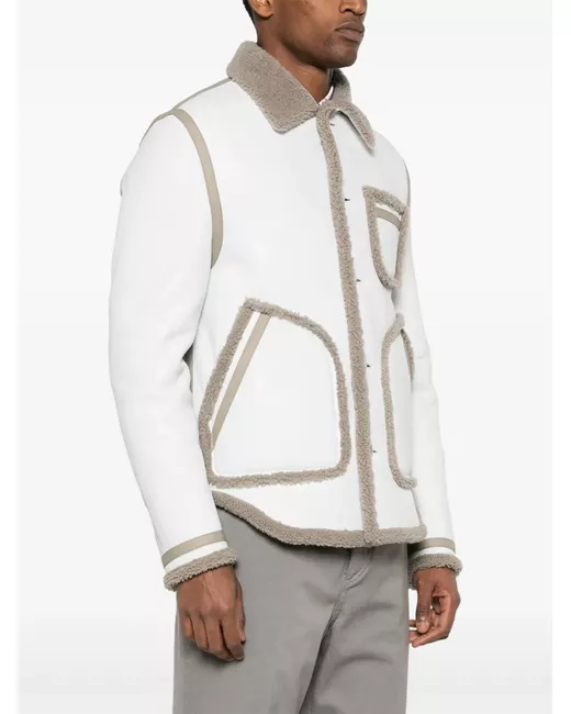 white/grey calf leather shearling trim signature 4-Bar tab shearling collar front button fastening long sleeves three front patch pockets curved hem shearling lining