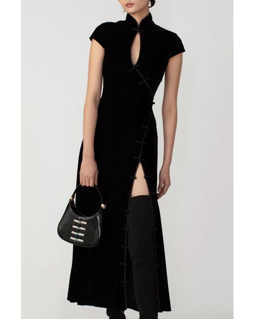 Vanessa is a Cheongsam-inspired velvet midi dress featuring a keyhole cut-out with a Mandarin collar, capped sleeves, and decorative classic pankou buttons.