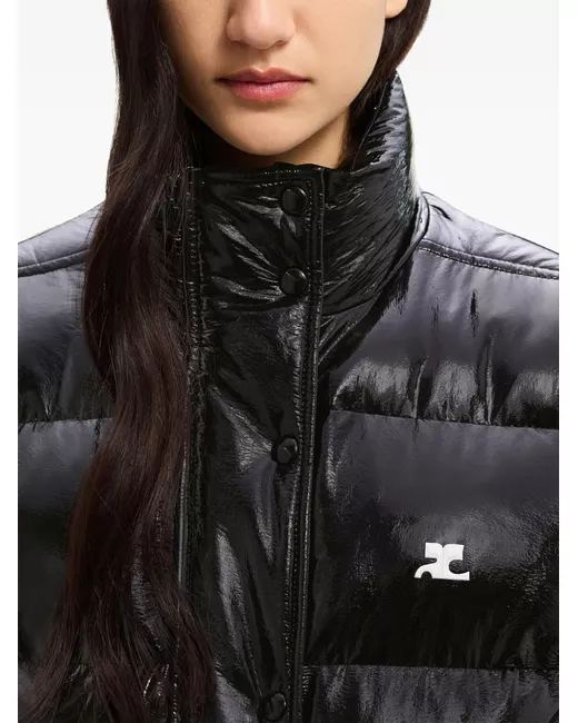 black glossy finish padded design logo print to the front high neck long sleeves two side slash pockets front button and zip fastening drawstring hem