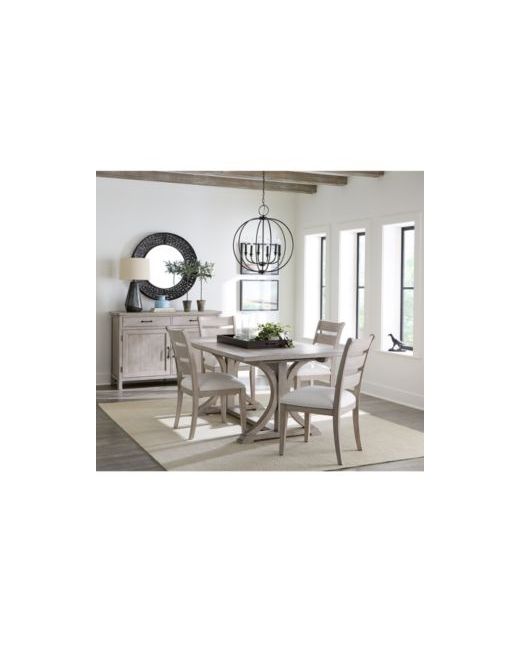 The Sadie 7-Pc. Rectangular Dining Set, featuring a table, four ladder back chairs, and two upholstered side chairs, beautifully combines modern simplicity with farmhouse charm. Crafted from sturdy Asian Hardwood Solids, this set showcases a rustic frosted grey finish. The rectangular table offers generous space for larger gatherings, while the four classic ladder back chairs provide support and style. The two upholstered side chairs, with padded seats and backrests, add comfort and elegance.