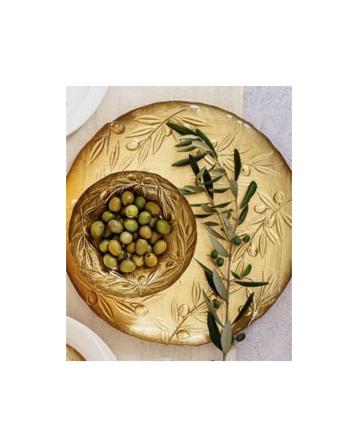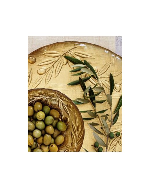 Taking inspiration from the traditional technique used by Italians to make picture frames, the Moon Glass Olive Round Platter features graceful olive vines on a warm, golden background.