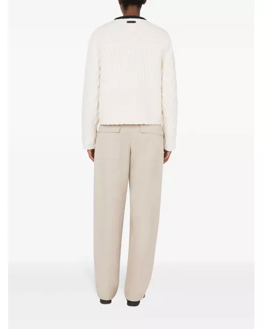 white front button fastening two front welt pockets logo patch to the rear crew neck