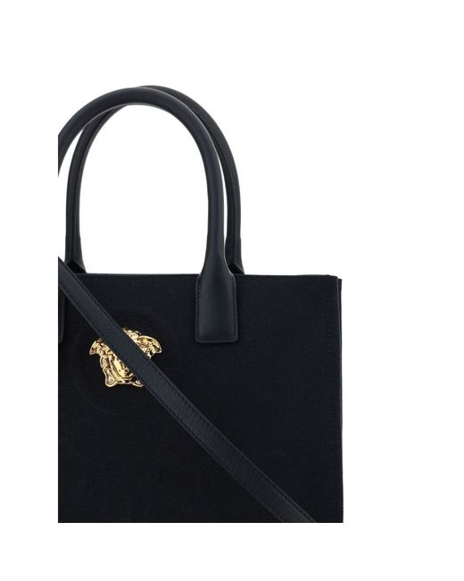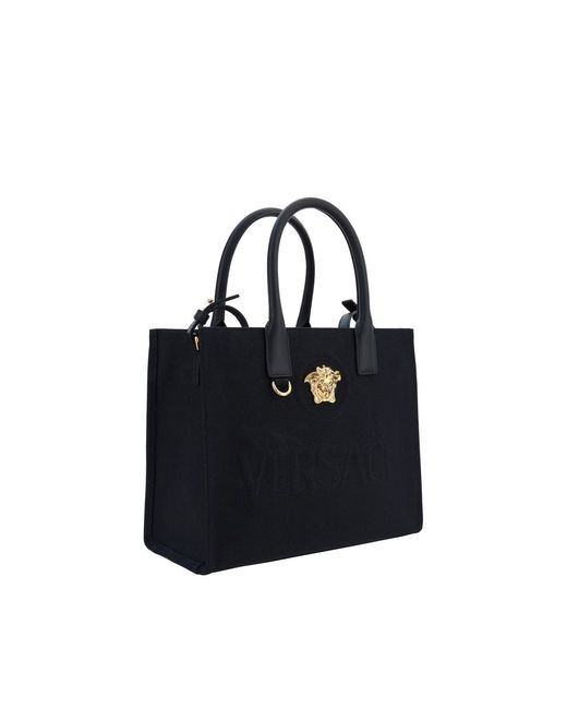 Cotton Shoulder Bag by Versace, rigid leather top handles, removable flat shoulder strap, top button closure, single interior compartment, iconic brand monogram embossed on front, leather feet at base, iconic Medusa embossed applique on front.