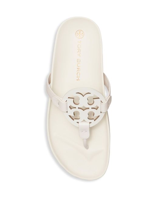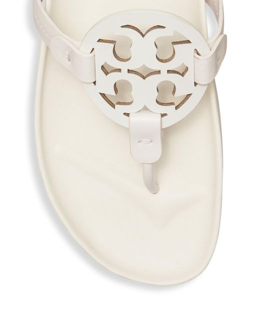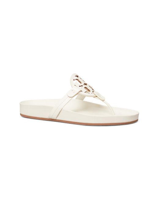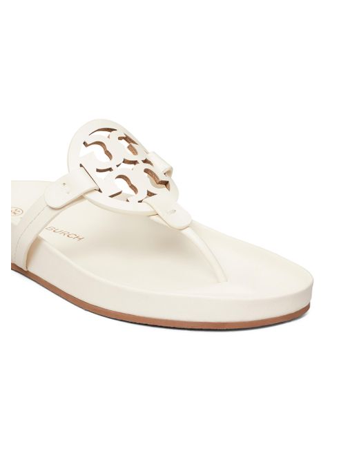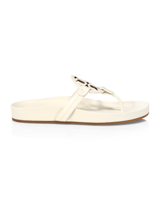 Tory Burch's Miller Cloud sandals are crafted of leather with a cut-out Double-T logo on the strap. Leather upper Thong toe Slips on Leather lining Molded footbed Rubber sole Imported This brand fits slightly smaller. Consider ordering half a size up. ABOUT THE BRAND Since debuting her brand in 2004, New York-based designer Tory Burch has made an impact on the fashion world with her handbags and shoes, and playful-yet-polished clothing. Today, Burch remains inspired by color and travel, with her vibrant collections bursting with prints, and her instantly recognizable double-T logo drawing from Moroccan architecture. Women's Shoes - Tory Burch Womens Shoes > Tory Burch > Saks Fifth Avenue > Barneys. Tory Burch. Color: New Ivory. Size: 10.