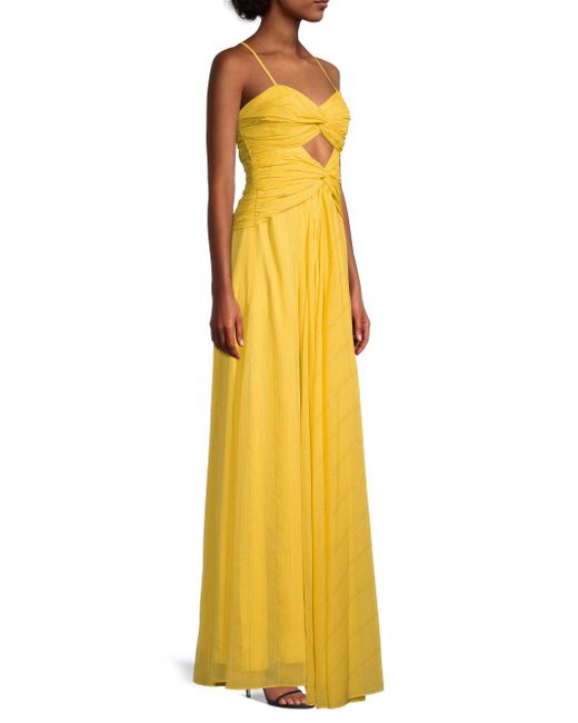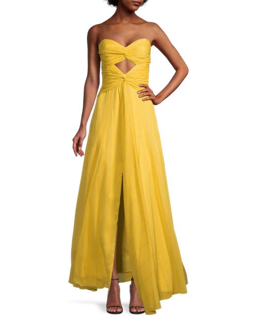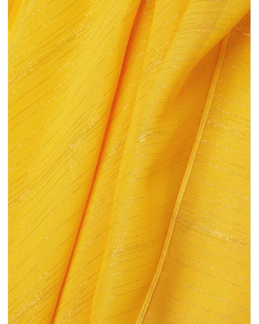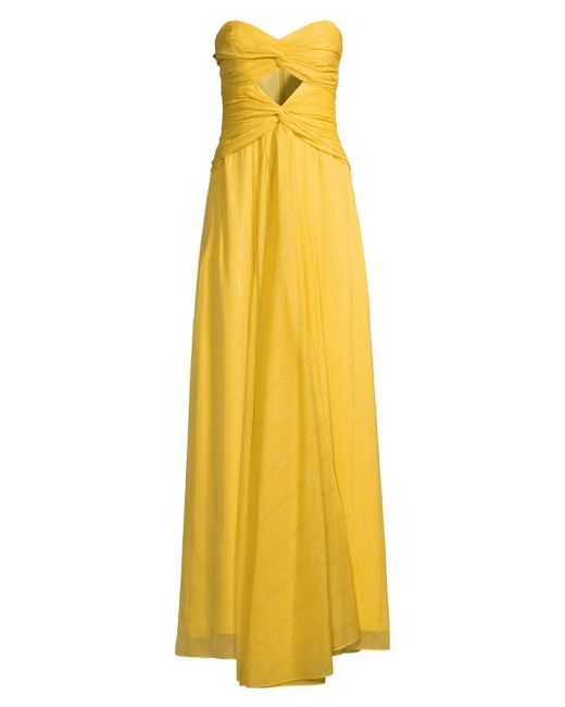 Floor-length gown made of pleated satin with subtle metallic details, and a diamond shaped cut-out at the front. Sweetheart neck Sleeveless Front skirt slit Back zipper closure 67% polyester/27% rayon/6% spandex Dry clean Imported SIZE & FIT About 55.25" from shoulder to hem Model measurements: 5'10" tall Model is wearing a US size 4 This brand fits slightly smaller. Consider ordering a size up. Dress Collections - Contemporary Evening > Likely > Saks Fifth Avenue > Barneys. Likely. Color: Tangerine. Size: 8.