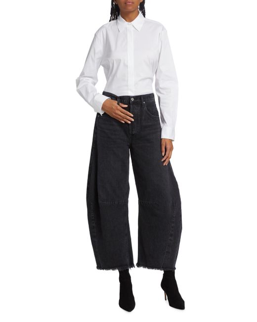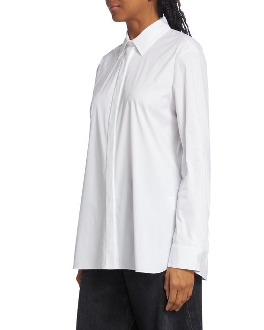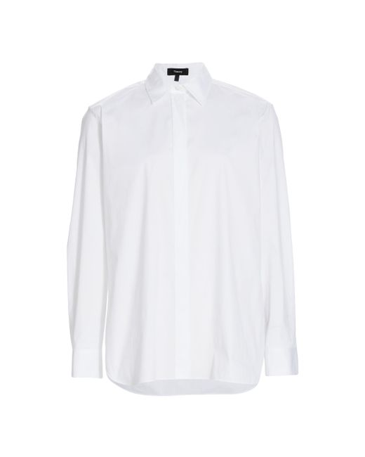Theory's classic tailored shirt is crafted of a cotton blend. This menswear-inspired style showcases a point collar, long sleeves, and a mother-of-pearl button front. Point collar Long sleeves Button-front placket 72% cotton/23% nylon/5% lycra spandex machine wash Imported SIZE & FIT This style is designed for an oversized fit Measurements are taken from a US size small About 27" from shoulder to hem Bust, about 41" Model measurements: 5'10" tall Model is wearing a US size Small. Contemporary Sportswear - Theory Sportswear > Theory > Saks Fifth Avenue > Barneys. Theory. Color: White. Size: XS.