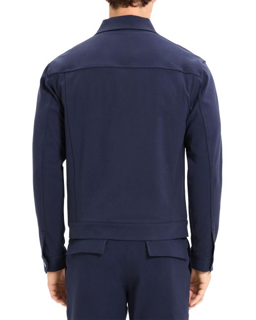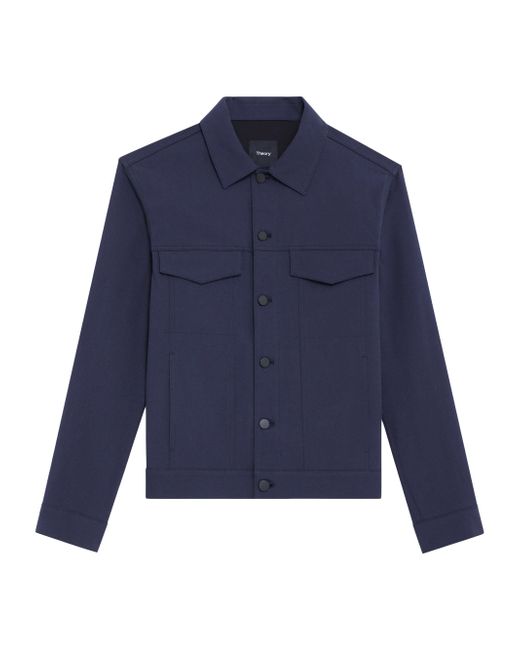 Theory's elevated iteration of the classic trucker jacket, this style maintains the traditional hardware, stitching, flap pockets, and front slip pockets. It's crafted with a twill version of neoteric, a breathable performance finish that boasts a four-way stretch. Point collar Long sleeves, buttoned cuffs Side seam pockets Front button closure 53% cotton/39% nylon/8% spandex Machine wash Imported SIZE & FIT About 25" from shoulder to hem Model measurements: 6'2" tall, 40" chest Model is wearing a US size Medium ABOUT THE BRAND For two decades, Theory has nailed the art of polished dressing through its well-tailored pieces. Innovative fabrications and an elevated, minimalist aesthetic make the brand's separates a wardrobe main story season after season. Mens Modern Coll & Outer - Theory > Theory > Saks Fifth Avenue > Barneys. Theory. Color: Dark Navy. Size: Small.