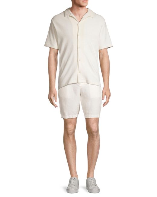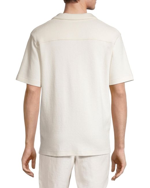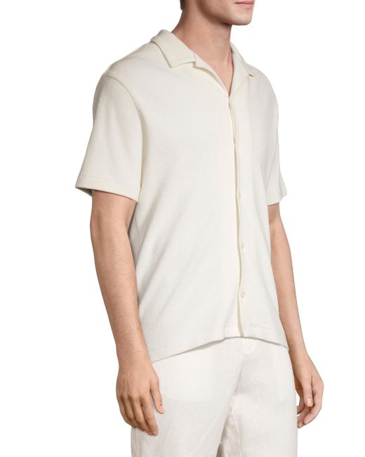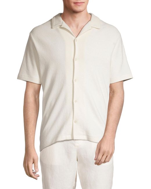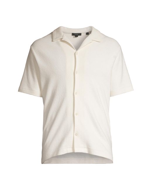 This Vince top is a button-front camp shirt that is knit in a textural blend of cotton bouclé, making it a luxurious everyday layering essential. Camp collar Short sleeves Button-front placket 96% cotton/4% polyester Machine wash Imported SIZE & FIT About 28'' from shoulder to hem Model measurements: 6'1" tall, 37" chest, 30.5" waist Model is wearing a US size Medium. Mens Modern Coll & Outer - Modern Collections > Vince > Saks Fifth Avenue > Barneys. Vince. Color: Bone. Size: Large.