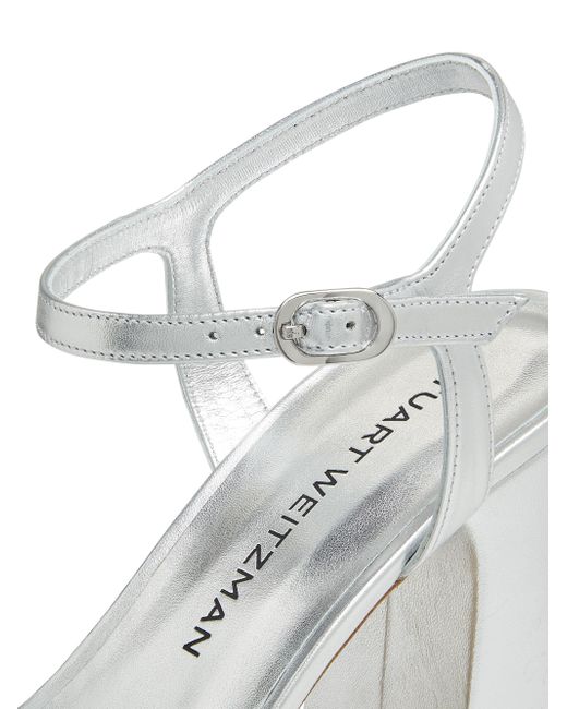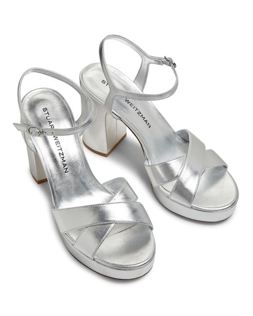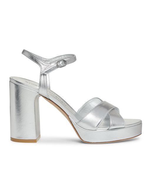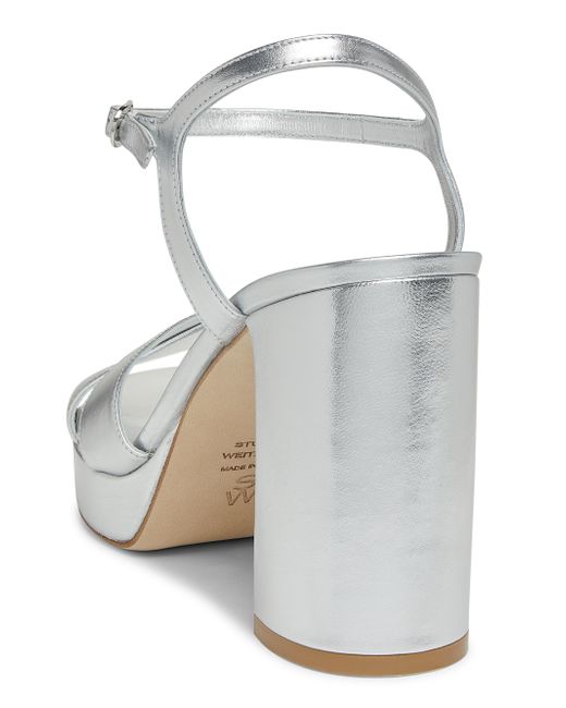 Stuart Weitzman's Dayna platform sandals are crafted of liquid metallic leather. The pair features a buckle closure and is made in Spain. Open toe Buckle closure Leather upper Leather/TPU sole Made in Spain SIZE Platform heel: about 4" (100mm) ABOUT THE BRAND Designer Stuart Weitzman started his career designing for his father's shoe company, before launching his own brand in 1986. Known for his glamorous pumps and over-the-knee boots, Weitzman has also incorporated unique materials in his designs, ranging from Lucite and wallpaper to cork, vinyl and even gold. Today, the label continues to create classic, feminine silhouettes that balance both comfort and style. Women's Shoes - Stuart Weitzman Wmn Shoe > Stuart Weitzman > Saks Fifth Avenue > Barneys. Stuart Weitzman. Color: Silver. Size: 11.