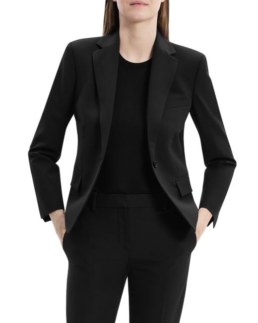 Theory's one-button slim single-breasted blazer features traditional front pocket details and clean sleeve vents. Crafted of stretch wool, this polished piece features front darts for a tailored finish. Notch lapels Long sleeves, button cuffs Front flap pockets Button-front closure 96% wool/4% elastane Dry clean Imported SIZE & FIT About 22.25" from shoulder to hem Model measurements: 5'10" tall Model is wearing a US size 4 ABOUT THE BRAND In 2000, founders Andrew Rosen and Elie Tahari launched Theory with a focus on innovative, comfortable stretch pants for women. Since then, the New York-based brand has become well-known for its mastery of polished, well-tailored separates for women and men. Contemporary Sportswear - Theory Sportswear > Theory > Saks Fifth Avenue > Barneys. Theory. Color: Black. Size: 00.