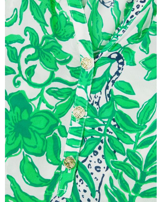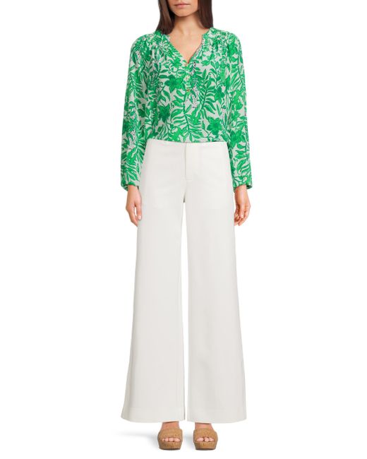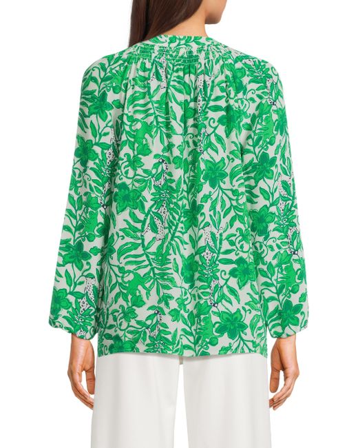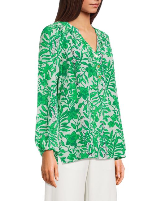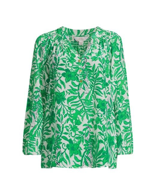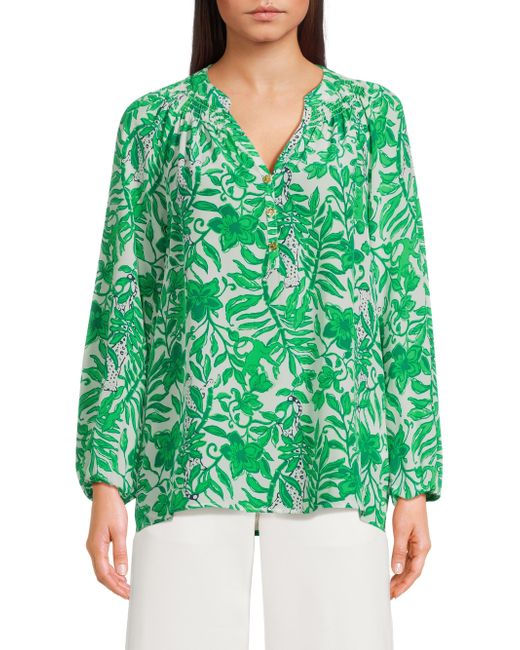 Crafted of luxe silk, Lilly Pulitzer's Elsa top showcases a V-neck, long sleeves with bubbled cuffs, and a bright leafy print. V-neck Long sleeves, elasticized cuffs Pulls over 100% silk Dry clean Imported SIZE & FIT About 28" from shoulder to hem Model measurements: 5'10" tall Model is wearing a US size Small. Modern Collections - Lilly Pulitzer > Lilly Pulitzer > Saks Fifth Avenue > Barneys. Lilly Pulitzer. Color: Fiddle Leaf Green. Size: XS.