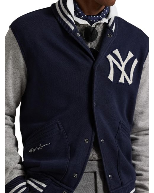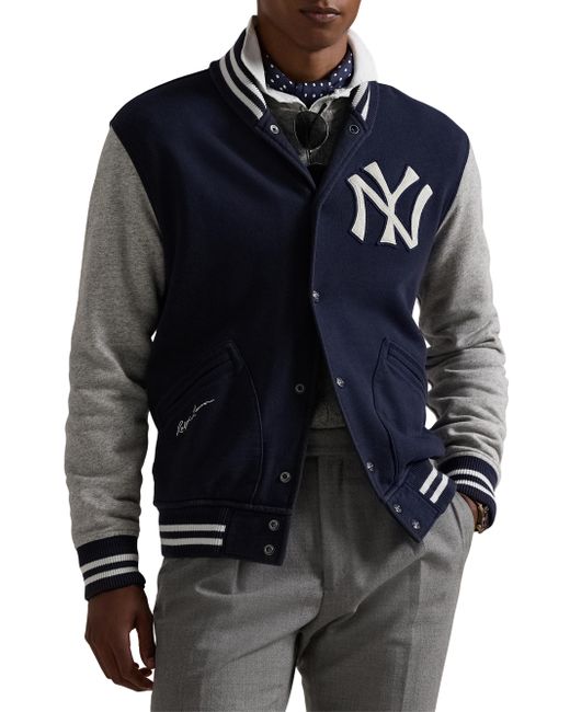 This Polo Ralph Lauren varsity jacket is crafted of cotton-blend fleece and styled with logo patches and striped trim. Stand collar Long sleeves Side slip pockets Front snap closure 87% cotton/13% polyester Combo: 87% cotton/13% polyester Machine wash Imported SIZE & FIT About 27" from shoulder to hem Model measurements: 6'2" tall, 31" waist Model is wearing a US size Medium. Men Luxury Coll - Polo Blue Label > Polo Ralph Lauren > Saks Fifth Avenue > Barneys. Polo Ralph Lauren. Color: Aviator Navy Loft Heather. Size: Large.