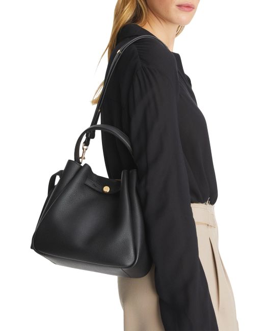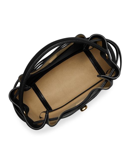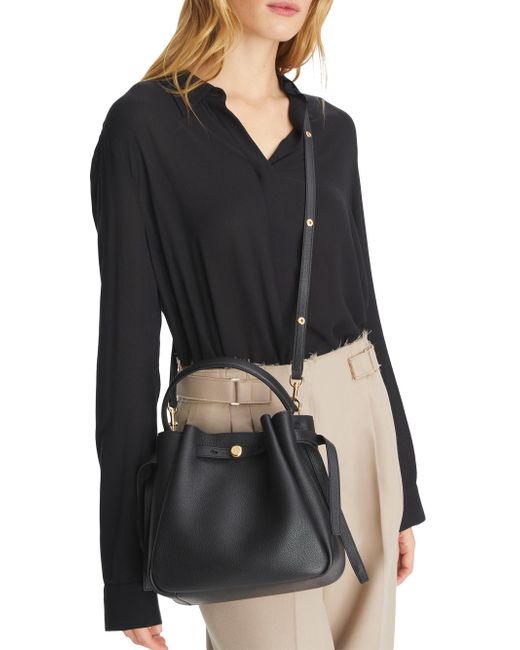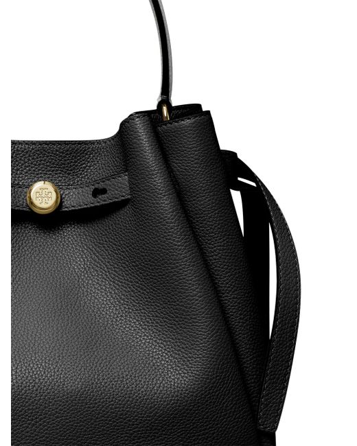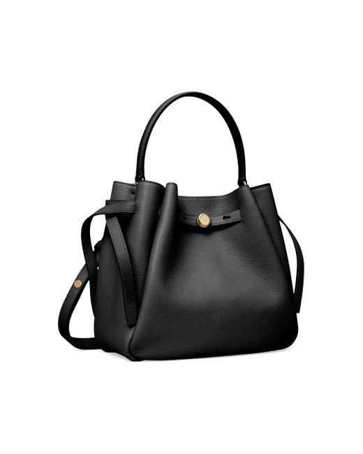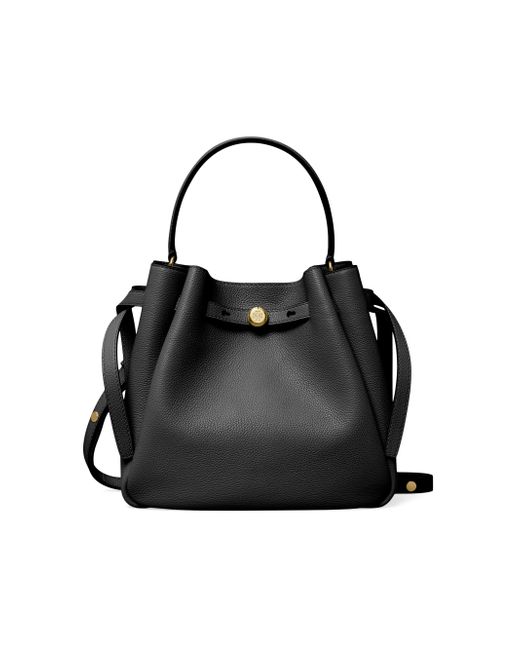 From the Romy Collection. Crafted of pebbled leather, this bucket bag from Tory Burch is designed with a top handle and an adjustable, removable strap. Top handle Adjustable, removable strap Drawstring stud closure Leather Imported SIZE About 8.5"H x 8.7"W x 3.7"D Top handle: about 5" drop Adjustable, removable strap: about 13"-21.5" drop ABOUT THE BRAND Since debuting her brand in 2004, New York-based designer Tory Burch has made an impact on the fashion world with her handbags and shoes, and playful-yet-polished clothing. Today, Burch remains inspired by color and travel, with her vibrant collections bursting with prints, and her instantly recognizable double-T logo drawing from Moroccan architecture. Handbags - Tory Burch Handbags > Tory Burch > Saks Fifth Avenue > Barneys. Tory Burch. Color: Black.