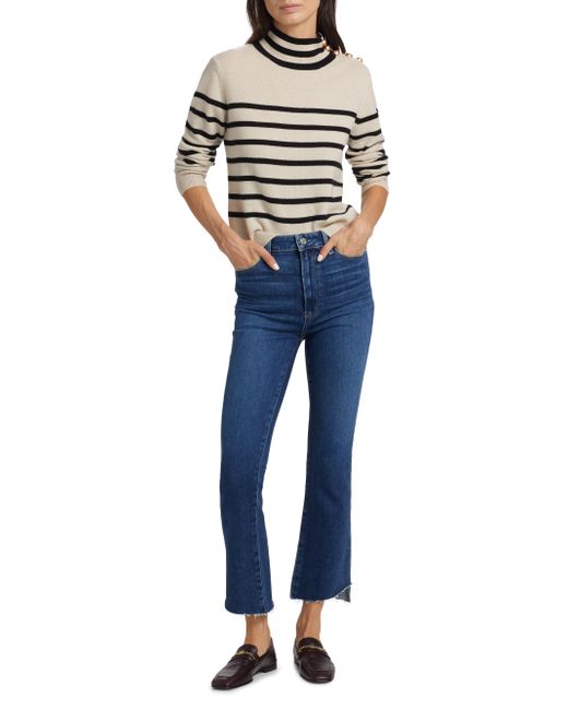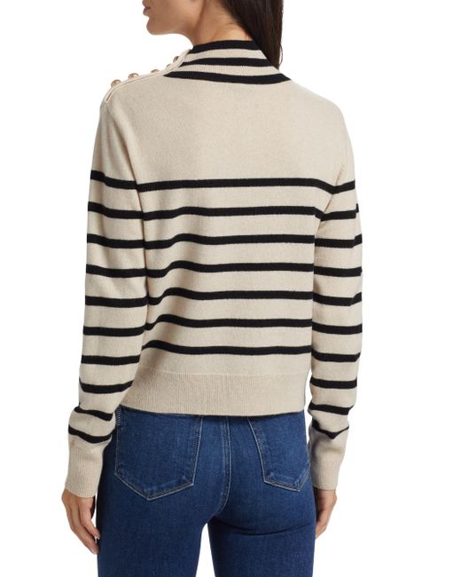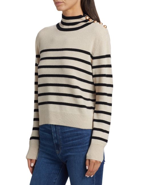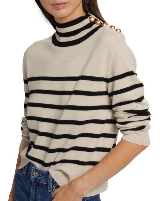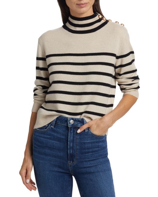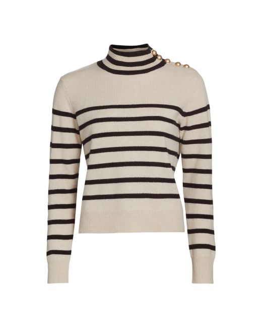 ONLY AT SAKS. Decorative buttons adorn the shoulder of Saks Fifth Avenue's mock turtleneck sweater. Knit from soft cashmere, this long-sleeve piece is designed with contrast stripes. Mock turtleneck Shoulder buttons Long sleeves Pulls over 100% cashmere Dry clean Imported SIZE & FIT About 22" from shoulder to hem Model measurements: 5'10" tall Model is wearing a US size Small. Private Brand - Sfa Knitwear > Saks Fifth Avenue > Saks Fifth Avenue > Barneys. Saks Fifth Avenue. Color: Creamy Heather Black. Size: XS.