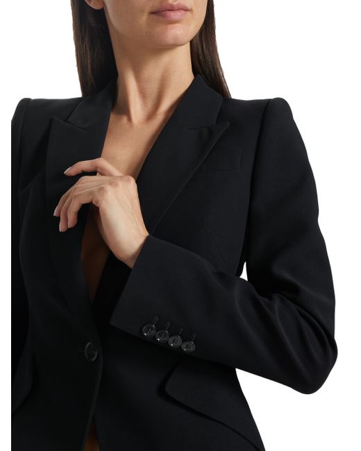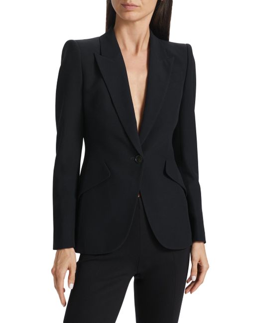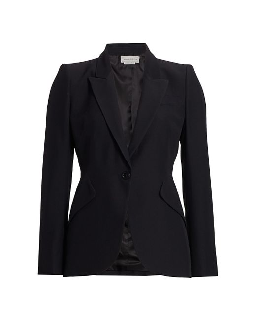 This Alexander McQueen jacket features a fitted silhouette with peak lapels. Tailored darts at the side waist with angled flap pockets define the look. Peak lapels Padded shoulders Long sleeves, button cuffs Chest welt pocket Waist flap pockets Button front closure 52% viscose/48% acetate Dry clean Made in Italy SIZE & FIT Measurements are taken from a US size 4 About 29" from shoulder to hem Waist, about 28" Bust, about 32" Model measurements: 5'11" tall Model is wearing a US size 4 Please Note: Compared to the Brand's Size Guide, this style measures true to size. ABOUT THE BRAND Visionary designer Lee Alexander McQueen launched his brand in 1992, which quickly became synonymous with cutting-edge, avant-garde design. Creative Director Seán McGirr has continued the designer's legacy, bringing precision craftsmanship and a feminine vision to the label's signature edge. Advanced European - Alexander Mcqueen > Mcqueen > Saks Fifth Avenue > Barneys. McQueen. Color: Black. Size: 2.