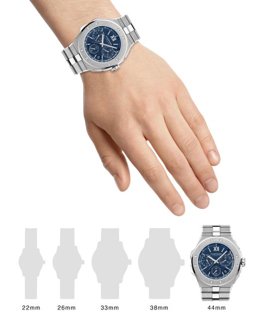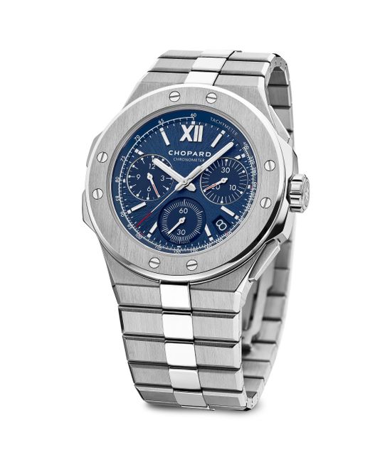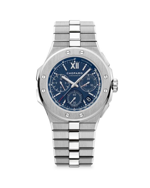 From the Alpine Eagle Collection. Contemporary, refined and assertive, this sport-chic timepiece is inspired by the design of the St. Moritz, powered by a Chronometer-certified movement within the sleek brushed stainless steel casing. The sunburst motif dial evokes the iris of the eagle - with rhodium-plated Roman numerals and hour markers. Mechanical chronograph movement Glare-proof scratch-resistant sapphire crystal Screw-down crown Steel blue sunburst dial Three subdials Roman numeral hour markers Second hand See-through sapphire crystal case back Stainless steel case and bracelet strap Deployant clasp Made in Switzerland FEATURES Water-resistant to 10 ATM SIZE Round case, 44mm (1.73") Bracelet strap, 23.4mm (0.92") ABOUT THE BRAND In 1860, artisan watchmaker Louis-Ulysse Chopard founded the renowned jewelry brand in Sonvilier, Switzerland. The company is known for its legendary Swiss watches and classic high fine jewelry designed to last a lifetime. Fine Jewelry - Chopard Watches And Jewe > Chopard > Saks Fifth Avenue > Barneys. Chopard.