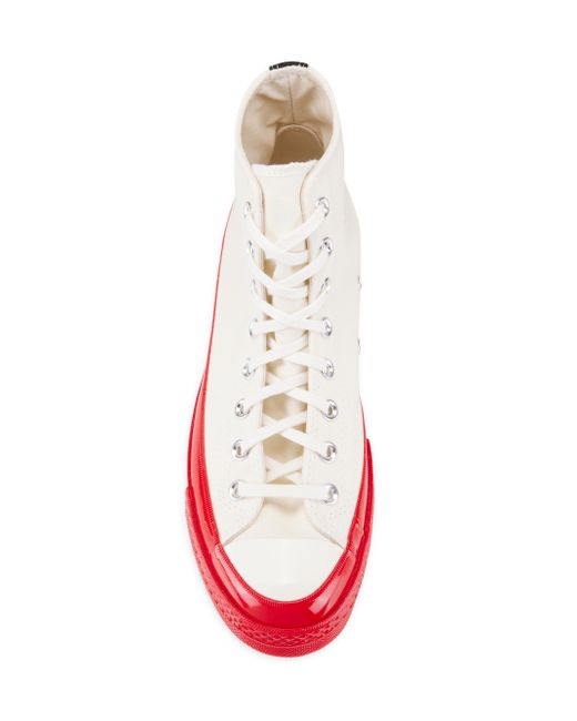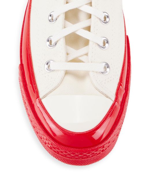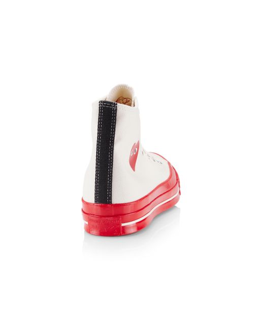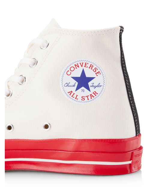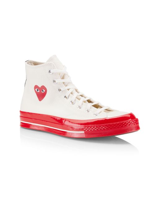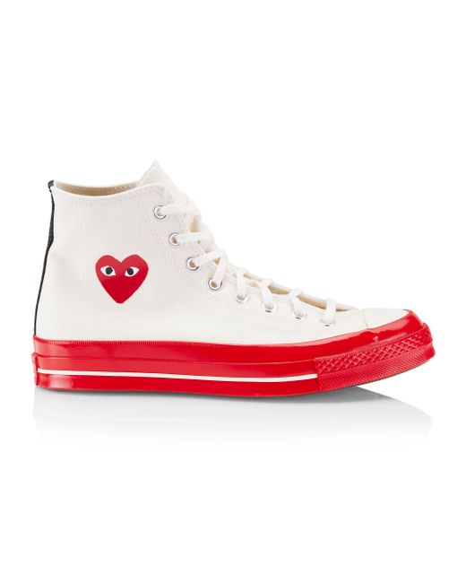 From the Comme des Garçons PLAY x Converse collaboration. An updated version of the Chuck Taylor All Star, these Chuck 70 sneakers are designed with Ortholite insole cushioning and winged tongue stitching. They feature the Japanese label's heart-and-eyes, a motif created for Rei Kawakubo by Filip Pagowskiin 2010. Canvas upper Round toe Lace-up style Rubber sole Imported. Men's Shoes - Contemporary Shoes > Comme Des Garçons Play > Saks Fifth Avenue > Barneys. Comme des Garçons PLAY. Color: Off White. Size: 7.