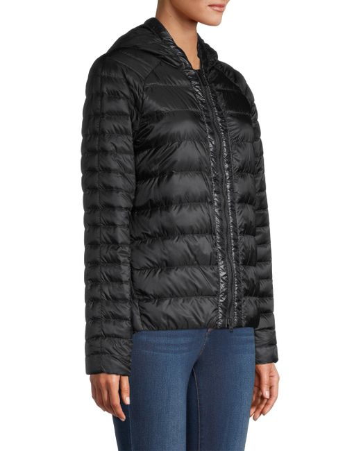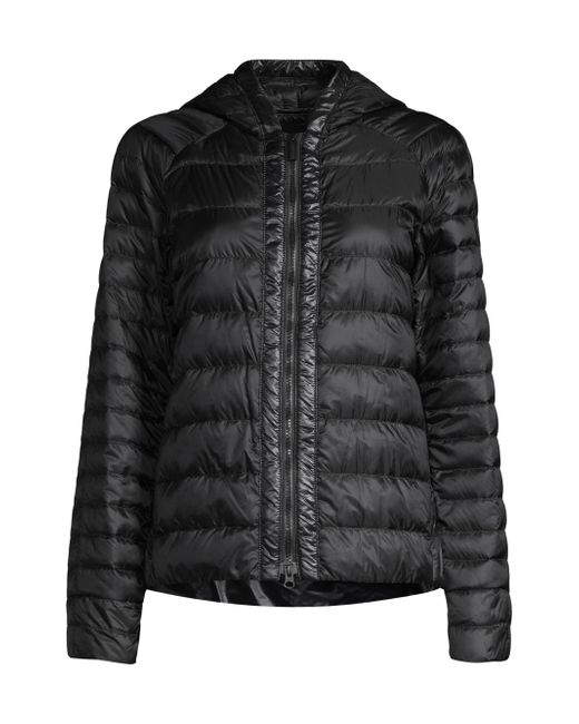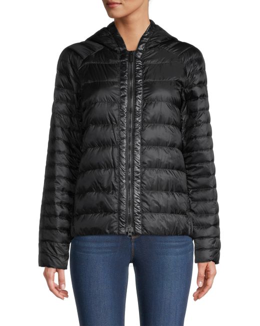 Hooded puffer jacket with tonal patch logo at chest. Attached hood Long sleeves Zip front Lining: 100% recycled polyamide Filling: 90% white duck down/10% white duck feathers 100% recycled polyamide Machine wash Made in Canada SIZE & FIT About 24" from shoulder to hem Model measurements: 5'10" tall Model is wearing a US size Small ABOUT THE BRAND Since its launch in 1957, Canada Goose's durable, ultra-warm parkas have become cold-weather staples worldwide. Using strong technical fabric, sustainably sourced down insulation and fur trim, the coats are designed to withstand extreme temperatures. Adapting to all seasons, the label designs luxe lightweight jackets, vests and accessories-and even cozy knit layers. Outerwear And Swimwear - Canada Goose > Canada Goose > Saks Fifth Avenue > Barneys. Canada Goose. Color: Black. Size: XS.