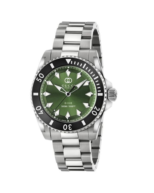 Gucci's Dive stainless steel bracelet watch offers a resilient design secured with sapphire crystal. Complete with a striking green dial, this timepiece features the house's signature interlocking G logo and three-hand movement. Automatic movement Fixed bezel Sapphire crystal Screw-down crown Green dial Indices hour markers Second hand Stainless steel case and bracelet Deployant clasp Two-year limited warranty Made in Switzerland FEATURES Water resistant to 30 ATM SIZE Round case: about 40mm (1.57'') ABOUT THE BRAND First launched in 1921, the Italian luxury fashion house quickly became known for its fine leather craftsmanship and accessories. Today, the visionary brand continues to redefine fashion trends, while celebrating creativity and innovation. Gucci's contemporary designs include shoes, clothing and accessories-often boasting the distinctive Horsebit motif. Men Accessories - Watches > Gucci > Saks Fifth Avenue > Barneys. Gucci. Color: Green Steel Black.