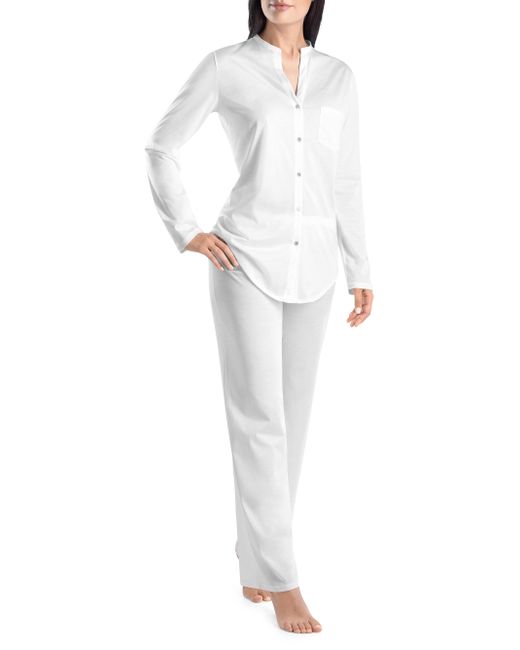 Wonderfully soft cotton pajamas for lounging nights and relaxing mornings. Cotton. Machine wash. Made in Portugal. TOP Splitneck Long sleeves Button front Patch pocket BOTTOM Elasticized waist Pull-on styling SIZE & FIT About 25" from shoulder to hem Inseam, about 29" Model measurements: 5'10" tall Model is wearing a US size Small. Lingerie - Hanro > Hanro > Saks Fifth Avenue > Barneys. Hanro. Color: White. Size: XS.
