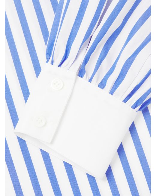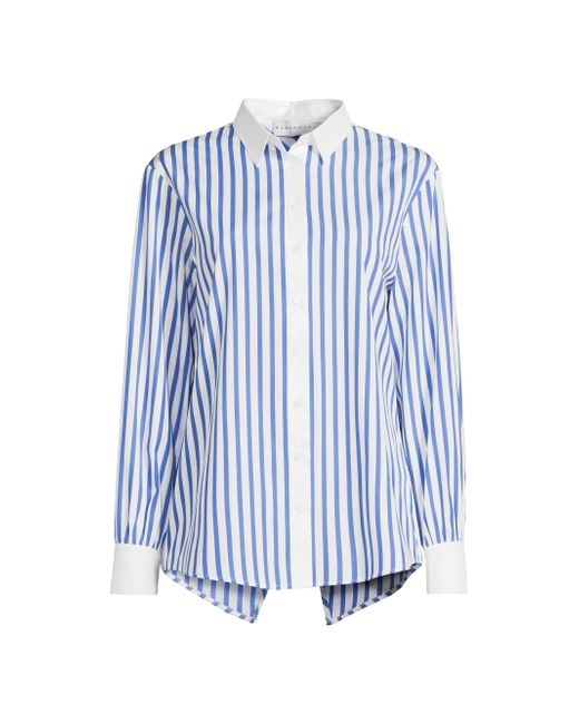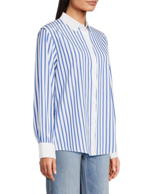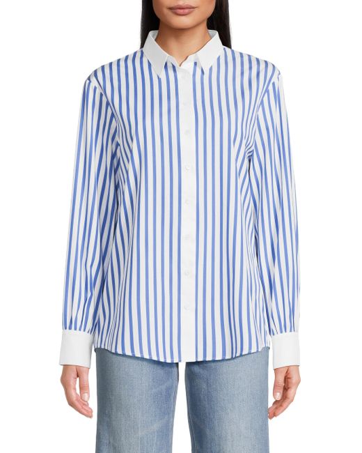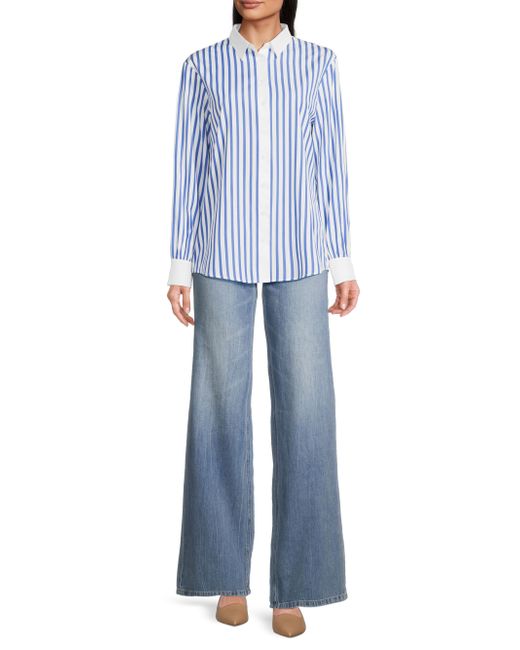 Crafted of crisp cotton poplin, the Franklin striped button-front shirt from Harshman is styled with contrasting solid trim and a cut out at the back hem. Spread collar Long sleeves, button cuffs Button-front closure 100% cotton Machine wash Imported SIZE & FIT About 27" from shoulder to hem Model measurements: 5'10" tall Model is wearing a US size Small. Modern Collections - Branded Separates > Harshman > Saks Fifth Avenue > Barneys. Harshman. Color: Indigo Stripes. Size: XS.