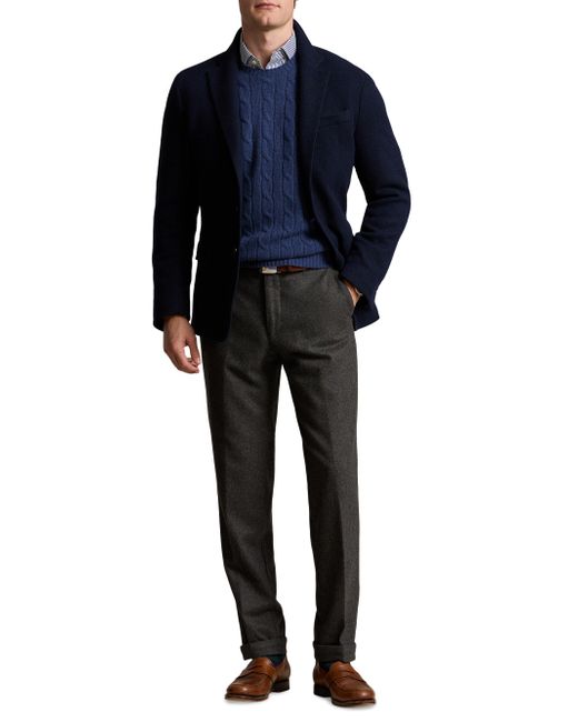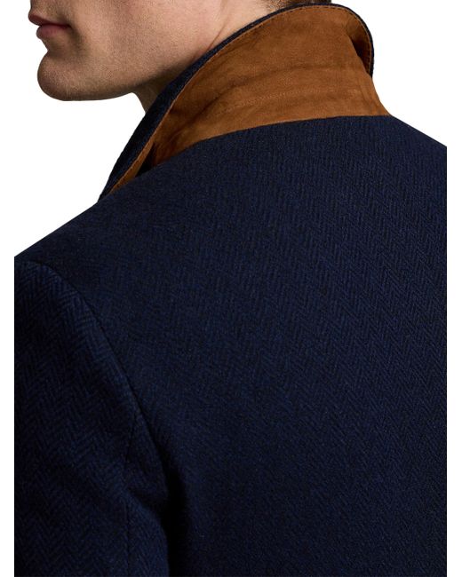 Crafted of a herringbone wool blend, this dapper Polo Ralph Lauren jacket features a timeless design with notch lapels and flap pockets. Waist darts complete the tailored piece. Notch lapel Long sleeves, button cuffs Chest welt pocket, side flap pockets Single-breasted, two-button closure 71% wool/24% nylon/5% other fibers Under collar: 70% wool/30% viscose Body lining: 55% polyester/45% viscose Sleeve lining: 52% viscose/48% acetate Dry clean Made in Portugal SIZE & FIT About 30" from shoulder to hem Model measurements: 6'2" tall, 40" chest, 31" waist Model is wearing a US size 40R. Men Luxury Coll - Polo Blue Label > Polo Ralph Lauren > Saks Fifth Avenue > Barneys. Polo Ralph Lauren. Color: Dark Navy. Size: 40.