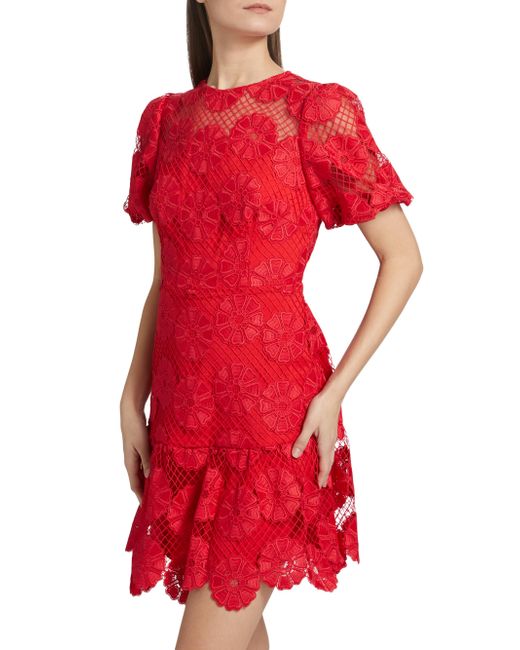 Crafted of charming lace, Milly's Yasmin minidress showcases a timeless fit-and-flare silhouette and romantic mesh yoke. Round neck Short sleeves Concealed back zip closure 100% polyester Lining: 97% polyester 3% spandex Dry clean Imported SIZE & FIT About 34" from shoulder to hem Bust: about 37" Model measurements: 5'10" tall Model is wearing a US size 4 Please Note: Compared to the Saks Size Guide, this style measures true to size. Modern Collections - Milly > Milly > Saks Fifth Avenue > Barneys. Milly. Color: Red. Size: 0.