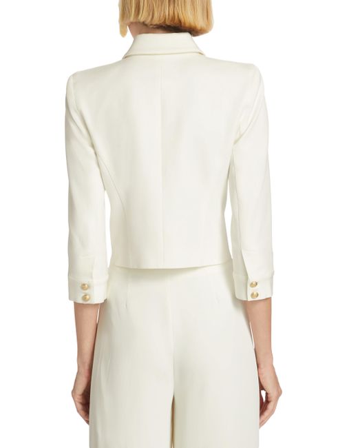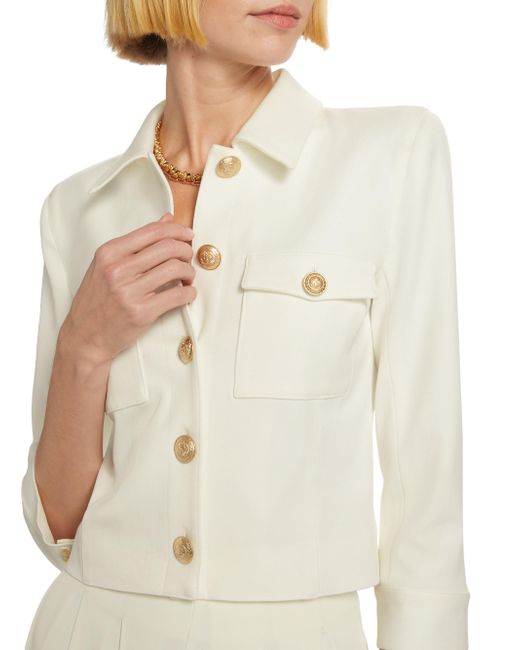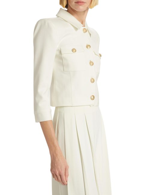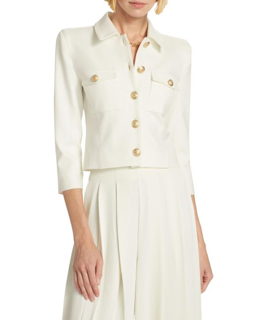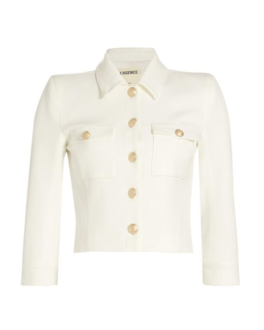 L'AGENCE's Kumi crop jacket is crafted of twill. This fitted style features a spread collar, three-quarter-length sleeves, and chest pockets. Spread collar Three-quarter-length sleeves, buttoned cuffs Chest button-through flap-patch pockets Front button closure 68% polyester/29% rayon/3% spandex Dry clean only Imported SIZE & FIT About 19.5" from shoulder to hem Bust: about 35" Model measurements: 5'10" tall Model is wearing a US size 4 Please Note: Compared to the Saks Size Guide, this style measures small. ABOUT THE BRAND Founded in 2008, L'Agence marries Southern California ease with chic Parisian style. Using luxurious fabrics, the Los Angeles-based label delivers feminine collections that are both timeless and versatile. In 2015, the label launched a denim line in a range of sleek, impeccably tailored cuts. Contemporary Sportswear - Workshop > L'agence > Saks Fifth Avenue > Barneys. L'AGENCE. Color: White. Size: 0.