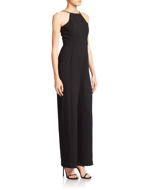 An elegant dress alternative in pebbled jacquard, with a fitted halter bodice and fluid wide legs. Halter neckline Sleeveless Seamed waist Slash pockets Wide leg Concealed back zip Lined About 55" from shoulder to hem Inseam, about 36" Nylon Dry clean Made in USA Please Note: This item runs small. Dress Collections - Contemporary Evening > Black Halo > Saks Fifth Avenue > Barneys. Black Halo. Color: Black. Size: 0.