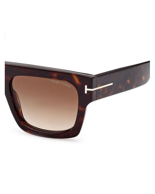 Tom Ford's sunglasses are designed in a structured geometric silhouette with a flat brow bar. Made in Italy, this bold pair is highlighted with a signature T logo at the hinges. 100% UV protection Gradient lenses Case and cleaning cloth included Plastic Made in Italy SIZE 53mm lens width 20mm bridge width 145mm temple length ABOUT THE BRAND After 10 years of serving as the Creative Director for several international luxury fashion houses, Tom Ford launched his own line of optical frames, sunglasses and beauty in 2005. The following year he debuted menswear, and in 2010, women's ready-to-wear. His sleek, tailored aesthetic has since catapulted him to mega-brand status. Soft Accessories - Sunglasses > Tom Ford > Saks Fifth Avenue > Barneys. TOM FORD. Color: Havana.