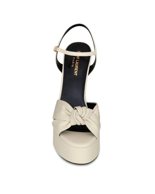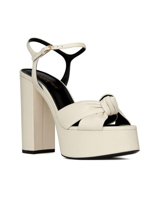 Platform sandals with crisscrossed front tied in a knot, featuring an adjustable ankle strap and covered block heel. Total Heel Height: 12.5 cm/ 4.9 Inches Arch Height: 8.5 cm/ 3.3 Inches Platform Height: 4 cm/ 1.5 Inches Leather Sole Adjustable Ankle Strap. Lsd Handbags - Saint Laurent > Saint Laurent > Saks Fifth Avenue > Barneys. Saint Laurent. Color: Pearl. Size: 7.