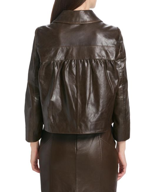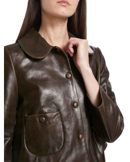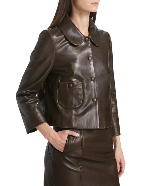 ba & sh's Milos pleated-back jacket is crafted of lamb leather. This style features a round collar, bracelet sleeves, and a single-patch pocket. Peter pan collar Bracelet sleeves Single-patch pocket Button-front closures 100% lamb leather Hand wash Imported SIZE & FIT About 20.3" from shoulder to hem Model measurements: 5'10" tall Model is wearing US size 4. Contemporary Sportswear - Contemporary Lifestyle > Ba & sh > Saks Fifth Avenue > Barneys. ba & sh. Color: Marron. Size: Small.