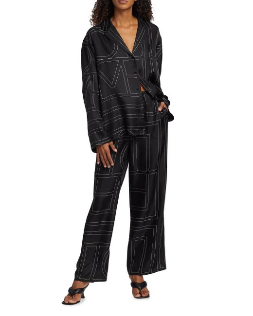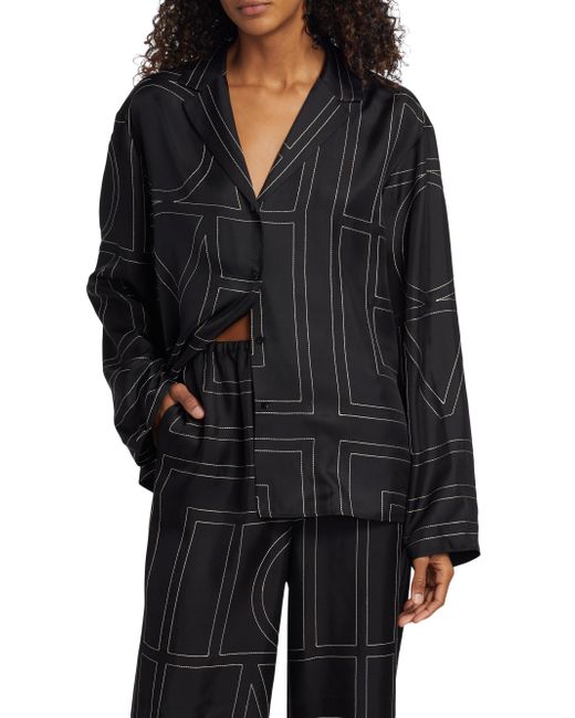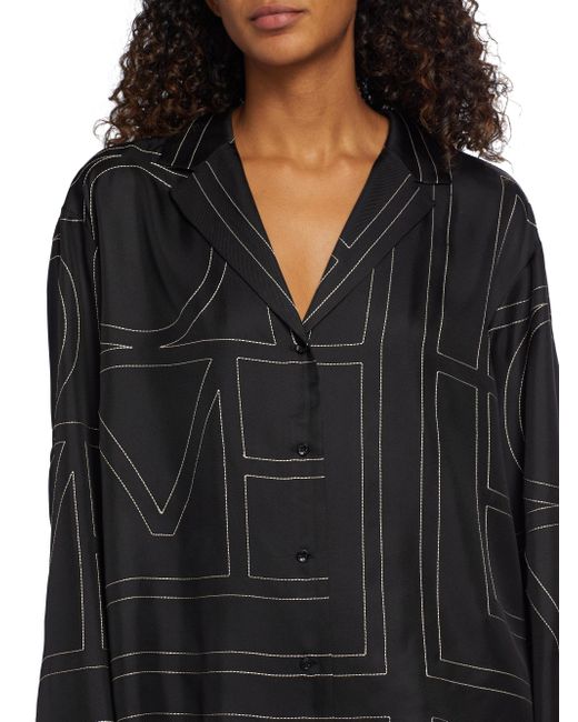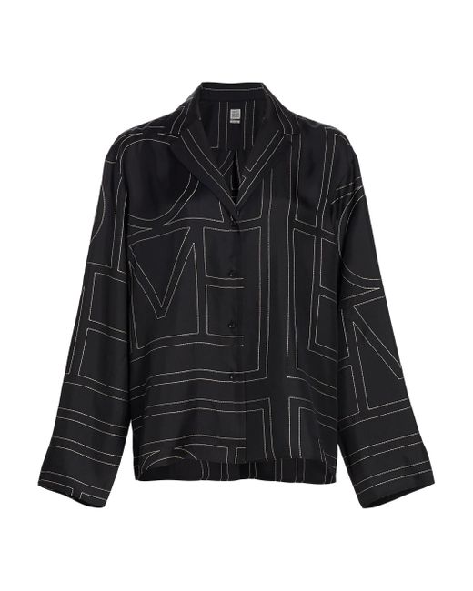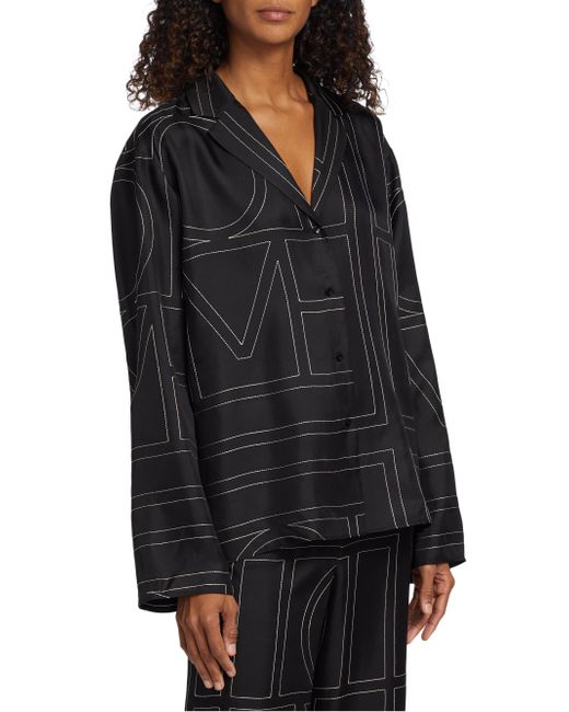 Woven from a lustrous silk, Totême's boxy button-front top is defined by a large-format stitched monogram motif. Please note: pattern may vary by style. Notch collar Drop shoulders Long sleeves Button front Back yoke 100% silk Dry clean Imported SIZE & FIT This style is designed for a relaxed fit Measurements are taken from a US size 4 About 27" from shoulder to hem Model measurements: 5'10" tall Model is wearing a US size 4. Advanced Designer - Designer Emerging Brands > Toteme > Saks Fifth Avenue > Barneys. Toteme. Color: Black Monogram. Size: 8.