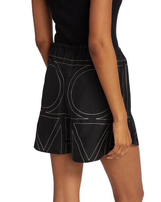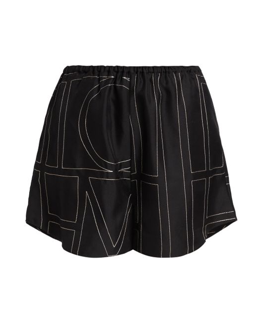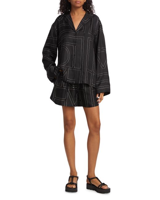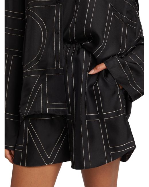Cut in a wide-leg silhouette, Totême's elasticized silk shorts are defined by a large stitched logo pattern. Elasticized waist Side seam pockets Round hem Pulls on 100% silk Dry clean Imported SIZE & FIT This style is designed for a relaxed fit Rise, about 13" Inseam, about 3" Leg opening, about 28" Model measurements: 5'10" tall Model is wearing a US size 4. Advanced Designer - Designer Emerging Brands > Toteme > Saks Fifth Avenue > Barneys. Toteme. Color: Black Monogram. Size: 6.