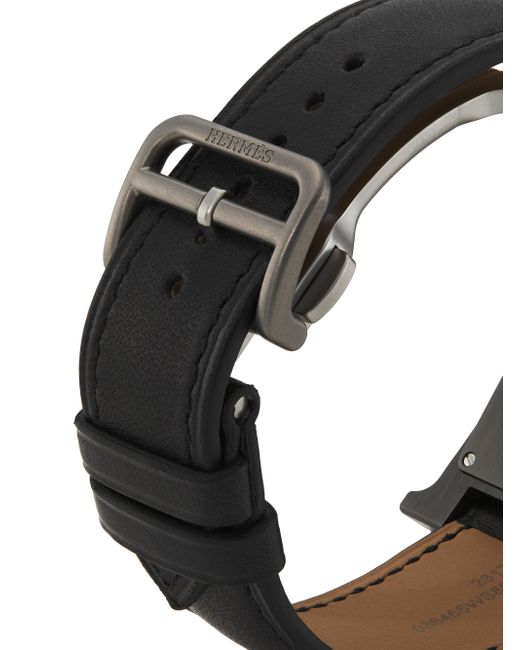 From the Heure H Collection. Hermès' titanium Heure H watch boasts the label's signature H bezel, a matte black dial, and Arabic numeral hour markers. Made in Switzerland, this chic timepiece secures with a luxe black leather strap. Unisex Calibre H1912 automatic movement Titanium fixed bezel Sapphire crystal Matte black dial Arabic numeral hour markers Seconds hand Titanium case/black leather strap Pin buckle closure Made in Switzerland FEATURES Water resistant to 3 ATM SIZE Square case, 34mm Strap width, 18.5mm. Fine Jewelry - Fine Watches > Hermès > Saks Fifth Avenue > Barneys. HERMÈS.
