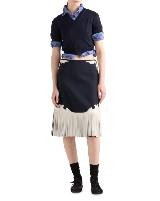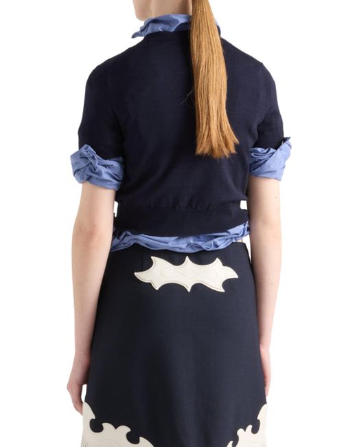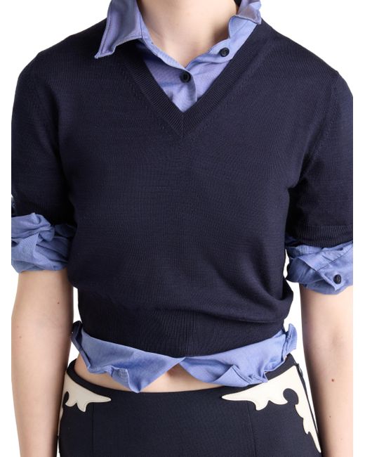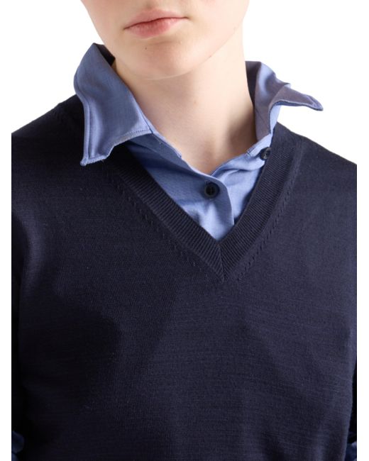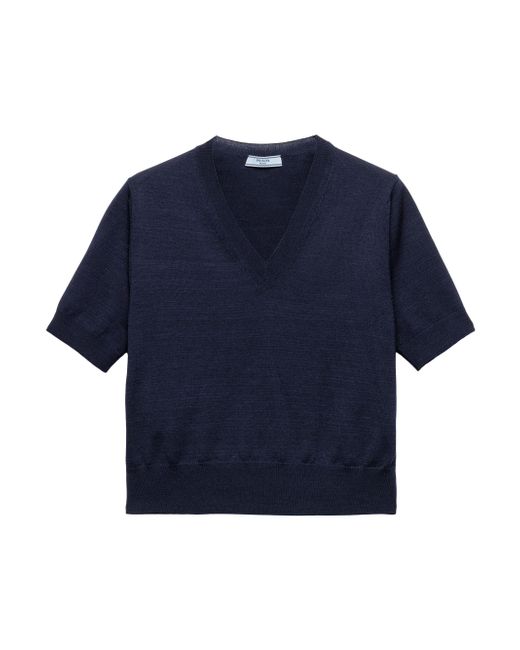 V-neck wool sweater. Short sleeves Plain knit Boxy fit Ribbed knit neck trim Semi-raglan shoulder Ribbed knit sleeve trim and hem Triangle logo Imported 100% Fleece Wool. Lsd Rtw - Prada Rtw > Prada > Saks Fifth Avenue > Barneys. Prada. Color: Blue. Size: 0.