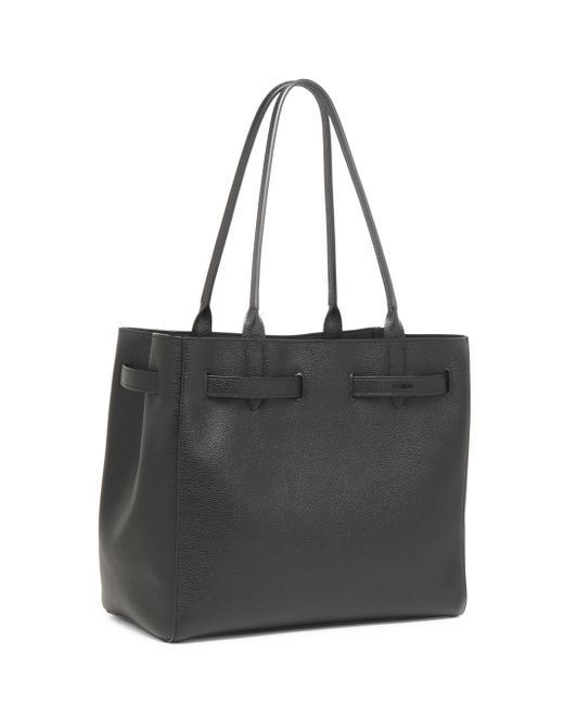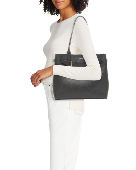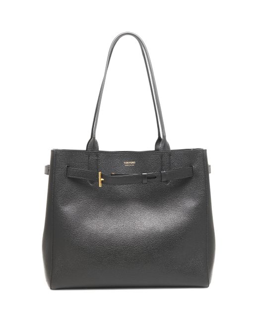From the Mini T Collection. This medium tote bag from TOM FORD features signature metal hardware and a strap with punched holes. Crafted in Italy from grain calf leather, the piece is designed with double handles, an adjustable strap, and multiple internal compartments for organization. Two shoulder straps Adjustable strap Interior: one zip pocket Drawstring closure Leather Made in Italy SIZE About 13"W x 11"H x 7"D Two shoulder straps: about 10" drop ABOUT THE BRAND After 10 years of serving as the Creative Director for several international luxury fashion houses, Tom Ford launched his own line of optical frames, sunglasses and beauty in 2005. The following year he debuted menswear, and in 2010, women's ready-to-wear. His sleek, tailored aesthetic has since catapulted him to mega-brand status. Handbags - Italian Designers > Tom Ford > Saks Fifth Avenue > Barneys. TOM FORD. Color: Black.