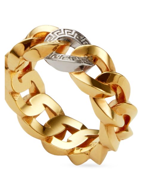 Versace's chunky two-tone ring features goldtone chain links highlighted by a single silvertone Greca-detailed link. Goldtone metal Made in Italy ABOUT THE BRAND Founded in 1978, Versace is instantly recognizable by the signature Medusa head logo, chosen by founder Gianni Versace for its Greek symbolism. The Italian label is known for its luxe, bold clothing and accessories-think gilding, oversized logos and punchy prints. Since taking over artistic direction, Gianni's sister Donatella Versace has maintained the brand's strong identity, with a renewed vision to give customers the ultimate freedom to express themselves. Fashion Jewelry - Trend Jewelry > Versace > Saks Fifth Avenue > Barneys. Versace. Color: Versace Gold. Size: 13.