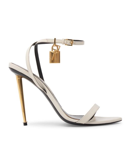 Anchored by a sculptural metal heel, Tom Ford's Padlock sandals are crafted of luxurious leather in Italy. This pair is styled with signature lock hardware at the dainty ankle strap. Leather upper Point open toe Ankle buckle strap Leather lining Leather sole Made in Italy SIZE Sculptural heel, 4" (105mm) This brand fits slightly smaller. Consider ordering half a size up. ABOUT THE BRAND After 10 years of serving as the Creative Director for several international luxury fashion houses, Tom Ford launched his own line of optical frames, sunglasses and beauty in 2005. The following year he debuted menswear, and in 2010, women's ready-to-wear. His sleek, tailored aesthetic has since catapulted him to mega-brand status. Women's Shoes - European Designer Shoes > Tom Ford > Saks Fifth Avenue > Barneys. TOM FORD. Color: Chalk. Size: 9.