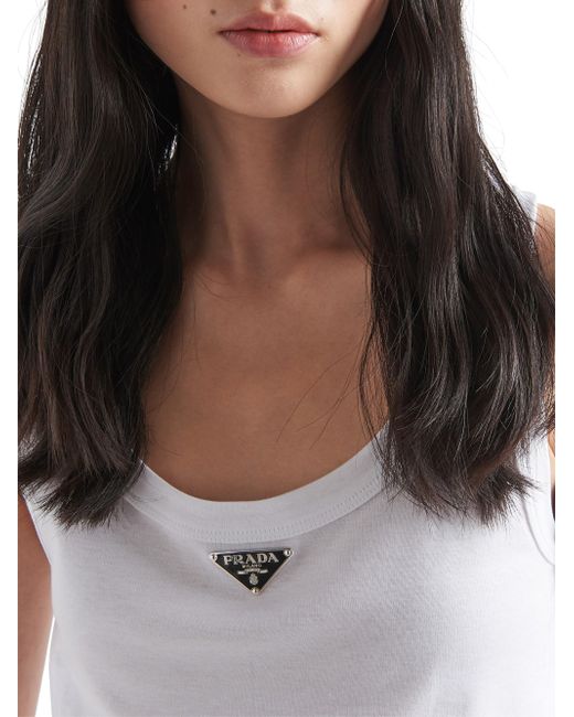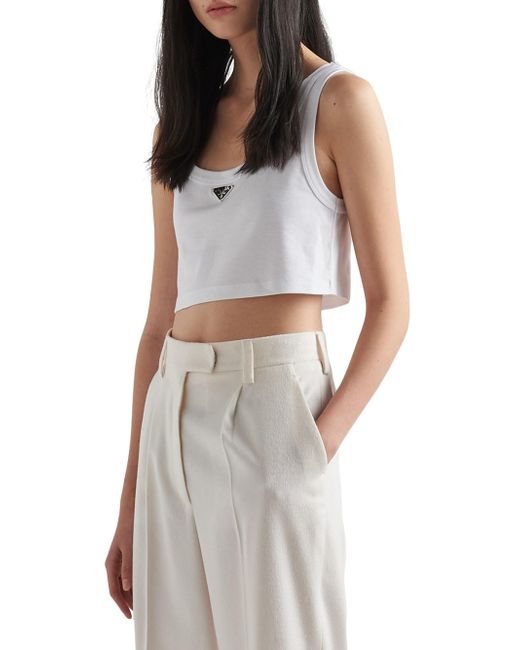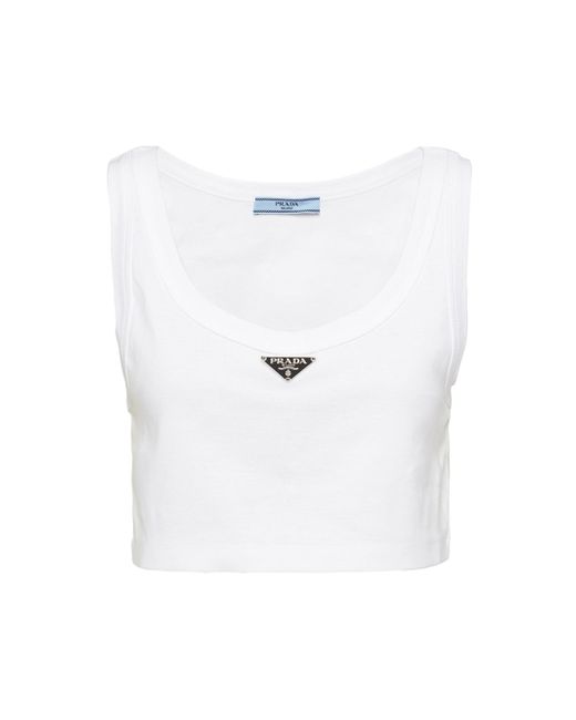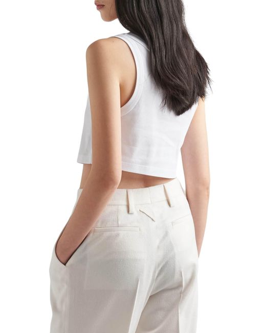 Pragmatic garments acquire new importance and value. This tank top with a typical menswear line is transformed by a feminine touch. Essentially Prada, the garment embodies the luxury of simplicity. The triangle logo stands out on the front. Cropped fit Ribbed knit Scoop neck Enameled metal triangle logo Imported 100% Cotton SIZE 0.0W x 37.0H x 0.0L. Lsd Rtw - Prada Rtw > Prada > Saks Fifth Avenue > Barneys. Prada. Color: White. Size: 0.