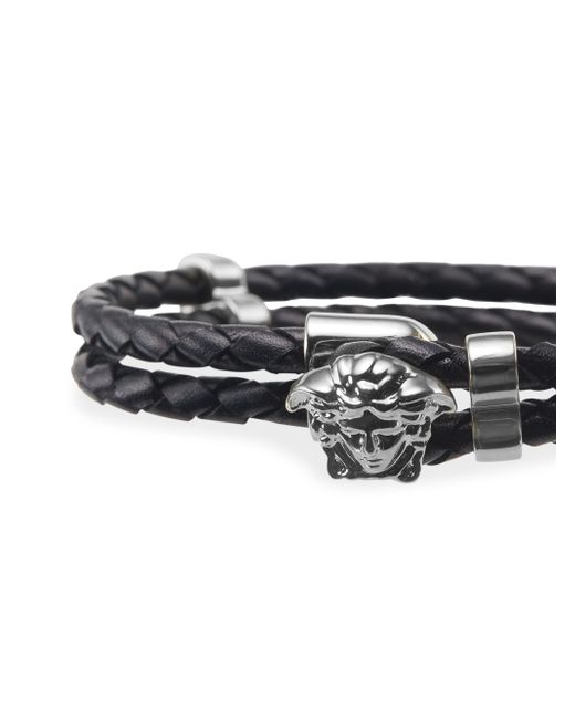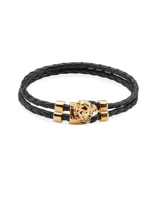 A signature goldtone medallion centers this double-wrap bracelet made of supple braided leather. Goldtone Leather Medusa buckle closure Made in Italy SIZE Length, about 8" ABOUT THE BRAND Founded in 1978, Versace is instantly recognizable by the signature Medusa head logo, chosen by founder Gianni Versace for its Greek symbolism. The Italian label is known for its luxe, bold clothing, sneakers, shoes and accessories-think gilding, oversized logos and punchy prints. Since taking over artistic direction, Gianni's sister Donatella Versace has maintained the brand's strong identity, with a renewed vision to give customers the ultimate freedom to express themselves. Men Accessories - Jewelry > Versace > Saks Fifth Avenue > Barneys. Versace. Color: Black.