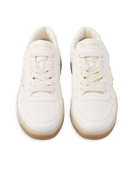 Downtown sneakers stand out for their versatile and contemporary style inspired by sporty designs with vintage charm. The footwear is characterized by perforated uppers in nappa leather and light rubber soles decorated with the enameled metal triangle logo. Upper with perforations Leather lining Enameled metal triangle logo Cotton laces Rubber sole, 30mm / 1.1'' Tread with geometric lines Removable leather-covered insole 100% Lamb leather Imported. Lsd Rtw - Prada Rtw > Prada > Saks Fifth Avenue > Barneys. Prada. Color: Off White. Size: 4.5.