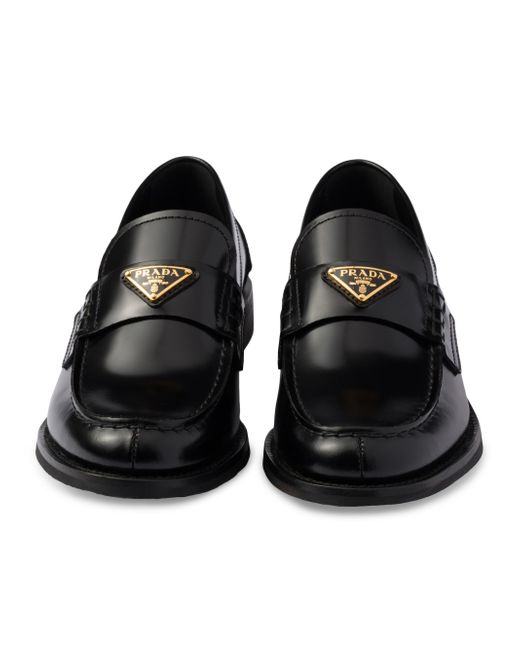 The timeless silhouette of these loafers stands out due to the finely crafted details and refined finish of brushed leather that enriches the design along with the distinctive triangle logo. Upper with leather band Enameled metal triangle logo Monoblock rubber sole with hot-stamped logo Heel height: 20mm / 0.7'' 100% Calf Leather Imported. Lsd Rtw - Prada Rtw > Prada > Saks Fifth Avenue > Barneys. Prada. Color: Black. Size: 7.