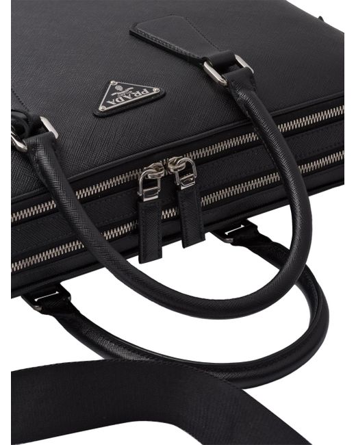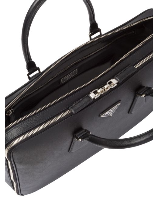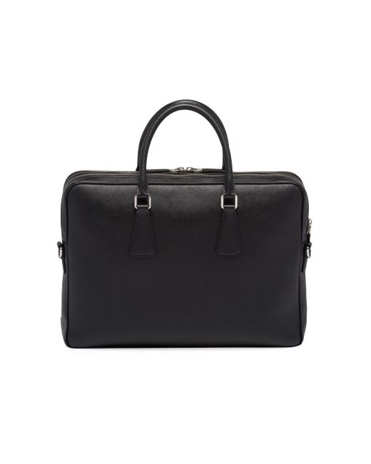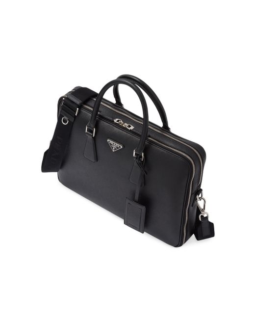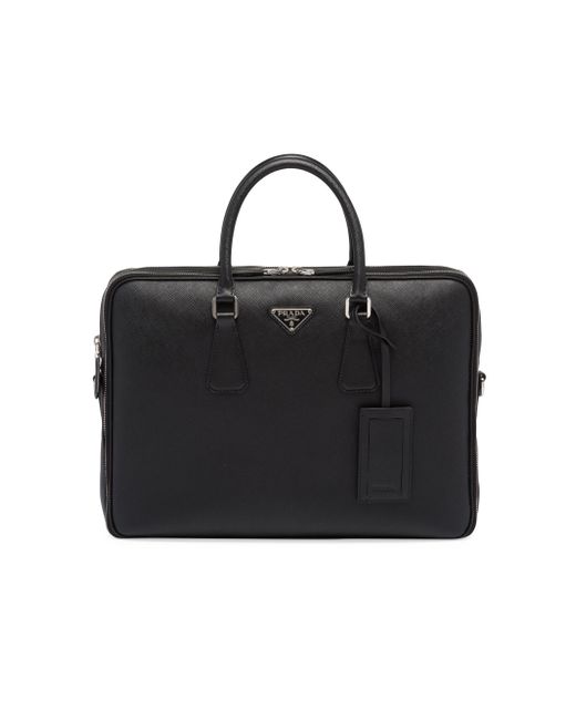 This elegant and refined briefcase is characterized by its functional structure composed of two compartments, a removable coin purse, various internal pockets, and a detachable nylon and leather shoulder strap. Made of Saffiano leather, an iconic material of the brand, the accessory is decorated with the emblematic enameled metal triangle logo, which first appeared in 1913 on trunks designed by Mario Prada. Two compartments Leather handles Detachable adjustable nylon tape and leather shoulder strap Enameled metal triangle logo on the front Zipper closure Removable leather name tag Interior with zipper pocket, patch pocket, and small patch pocket Logo-print nylon lining Imported SIZE: 38 W x 28 H x 6.5 L (cm). Lsd Rtw - Prada Rtw > Prada > Saks Fifth Avenue > Barneys. Prada. Color: Black.